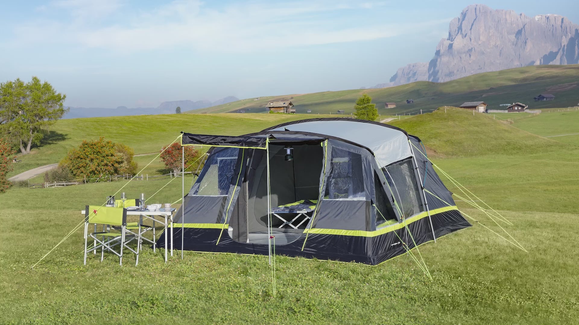 Eine vollständig eingenähte Bodenwanne aus robustem PE-Material schützt vor Feuchtigkeit und Schmutz und sorgt für eine trockene, komfortable Umgebung. Der Eingang führt in den geräumigen Wohnbereich, während zwei getrennte Schlafkabinen Privatsphäre bieten. Panoramafenster lassen viel Licht herein und bieten einen tollen Blick auf die Natur.