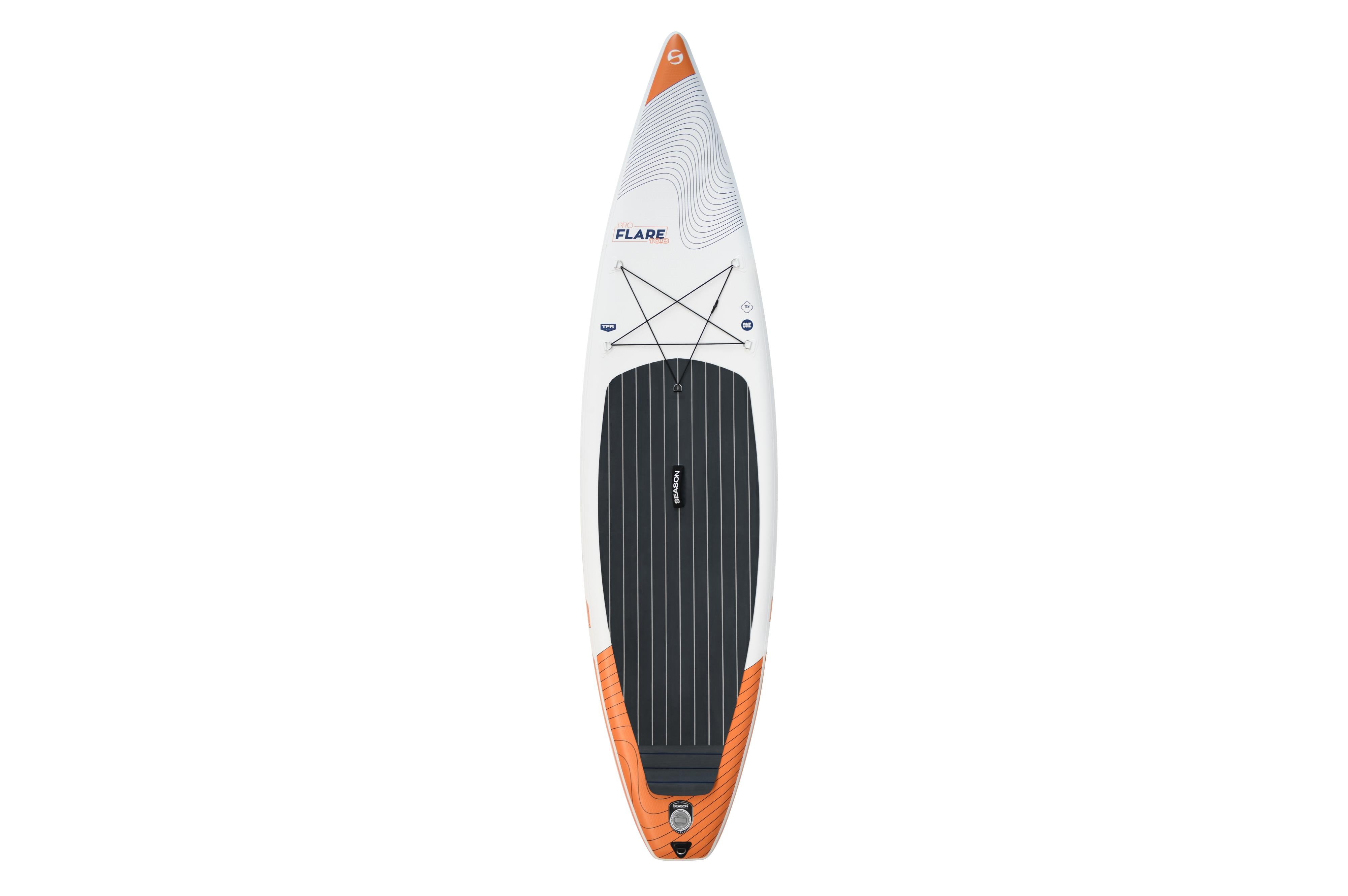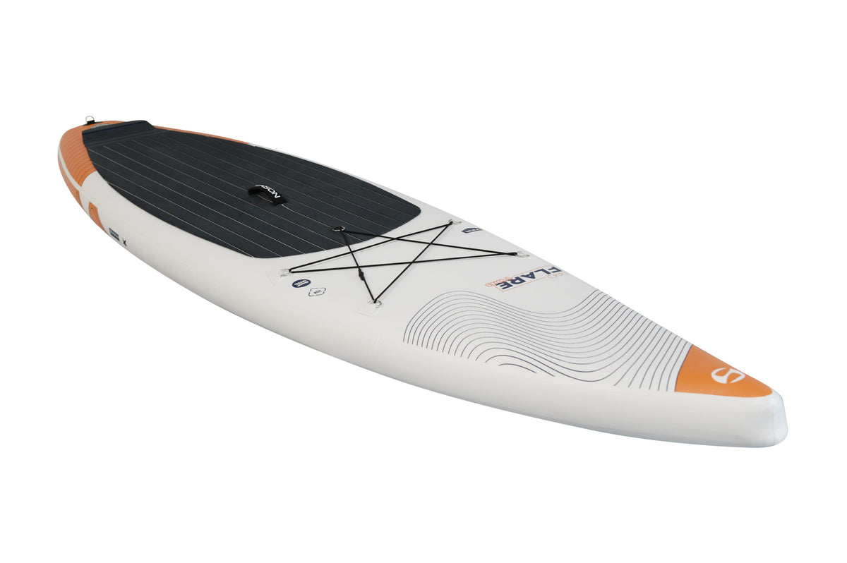 Das Flare Pro 10.8 ist eine Weiterentwicklung des sehr erfolgreichen Cruisers von 2020. Das Board ist für viele Einsatzbereiche geeignet und wird oft für längere Touren mit Gepäck oder auch auf leicht fliessenden Gewässern eingesetzt. Der Shape mit der breiten Standfläche und der schlanken Nose geben dem Board Standstabilität auch bei geringen Geschwindigkeiten, was das Spielen auf dem Wasser erleichtert. Die Form eines langen Tropfens lässt das Board aber auch gut gleiten. Da die Standfläche viel Volumen hat, trägt das Board auch etwas mehr Belastung. Die grosse EVA Standfläche ist mit einem Längsrillen Muster ausgestattet. Das Board kann auch bei Niedrigwasser mit einer Flexfin gefahren werden, ohne die Gefahr das Finnen abbrechen.